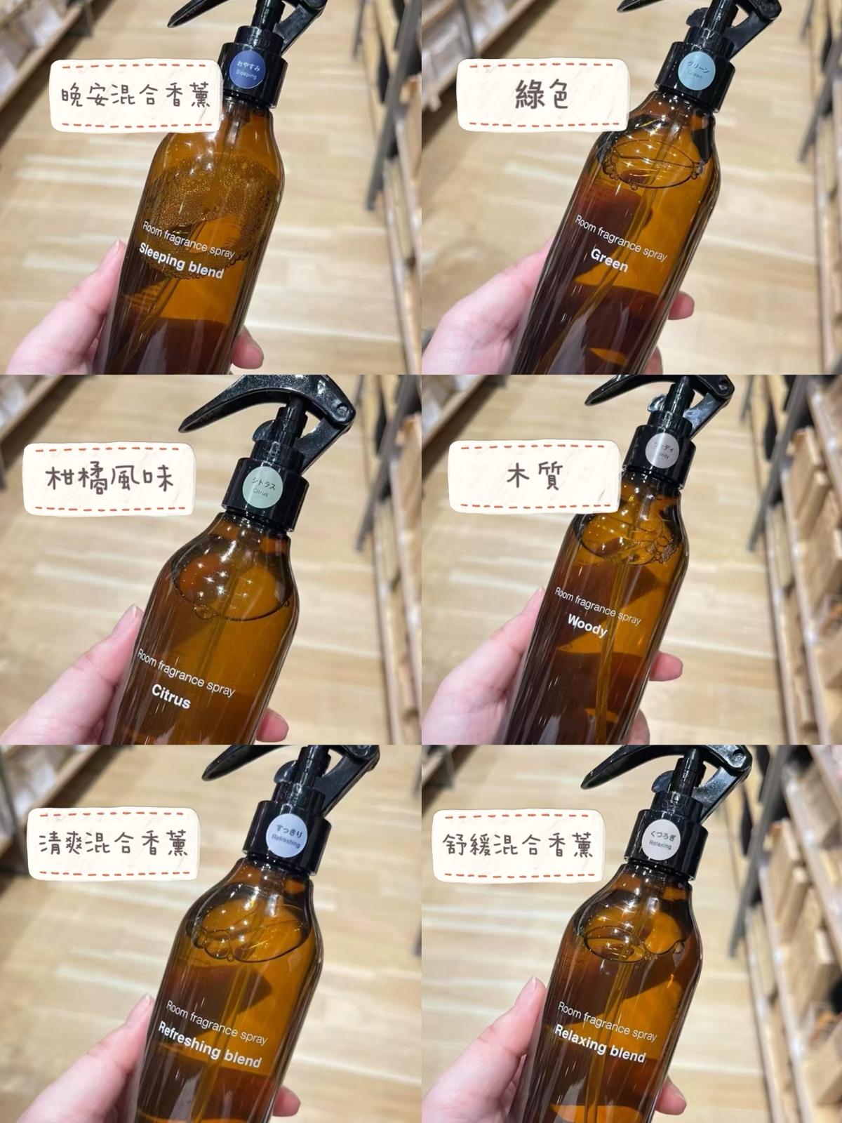 這款房間噴霧是一款僅使用精油調配的香氣噴霧,可以噴灑於空間或布織品上,合共有6款香氣: 【香調種類】 2)清爽混合:混合檸檬、尤加利等成分,呈現清澈爽朗的香調 3)舒緩混合:混合橙子、檸檬草、佛手柑等成分,呈現溫柔平和的香調 4)木質調:混合尤加利、檜木等溫潤香調 5)綠意調:混合薰衣草、鼠尾草等清涼香調 6)柑橘調:混合檸檬、橙子等清新香調